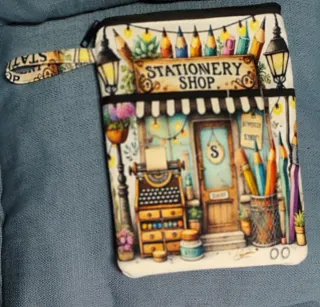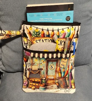 Funda artesanal con un diseño inspirado en papelería y material de escritura. Perfecta para proteger tu libro o como neceser. - Estampado Stationery con detalles de lápices, máquina de escribir y farolillos. - Cierre de cremallera. - Asa lateral para facilitar su transporte.
