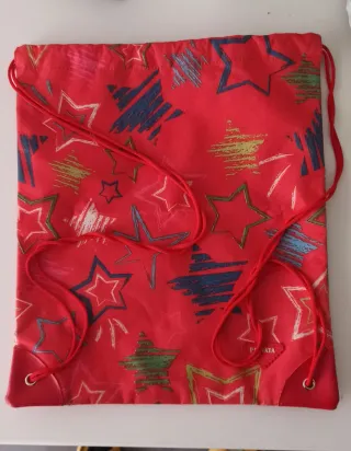 Práctica bolsa tipo mochila con un divertido estampado de estrellas. Ideal para llevar tus cosas. Material muy fuerte y resistente - Cierre con cordones. - Diseño multicolor sobre fondo rojo. - Detalle de logo en la parte inferior.