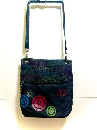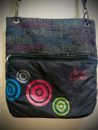 Bolso Desigual con un diseño llamativo y práctico. - Estampado de círculos concéntricos en varios colores. - Inscripción dream together en color rosa. - Parte superior con el logo Desigual repetido en diferentes tonalidades. Impermeable. Está usado pero solo presenta signos de uso la correa, por lo que incluyo una nueva correa multicolor. Regalo el segundo bolso con la compra.