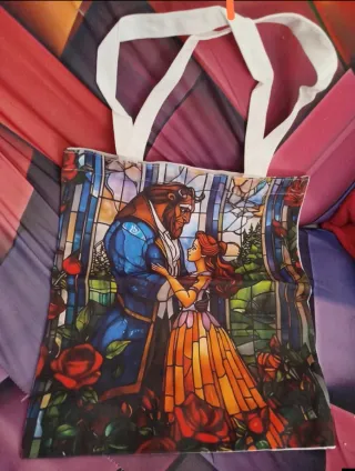 Bolso tote con un diseño inspirado en La Bella y la Bestia. - Ilustración de Bella y la Bestia. - Estampado con rosas rojas y detalles de vidrieras. -Sin estrenar -Marca al azar porque wallapop obliga a elegir una -Le he cosido una cremallera para que sea más seguro -También he cosido un bolsillo interior pequeño para guardar las llaves y objetos similares