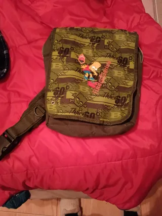 Bandolera con diseño de Bart Simpson. - Estampado de camuflaje. - Cierre de cremallera. - Correa ajustable.