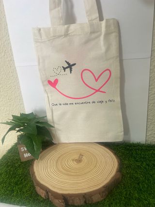 Práctica bolsa de tela con un diseño original y alegre. - Estampado de avión y corazón. - Frase Que la vida me encuentre de viaje y feliz. - Material de tela resistente. -26cm x 18cm