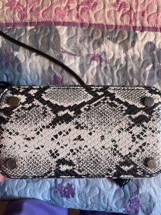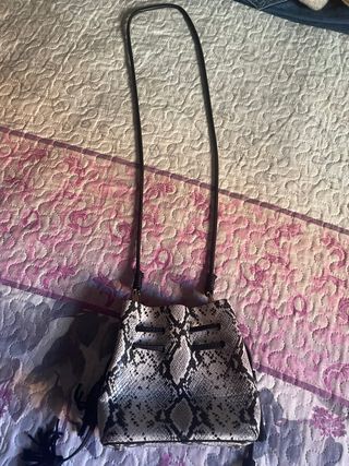 Bolso pequeño de la marca Mango con un llamativo estampado de serpiente. - Diseño tipo saco. - Cierre con cordón. - Adornos de flecos. - Correa ajustable. Tiene una pequeña rozadura que no se ve. ver tercera foto. por eso el precio.