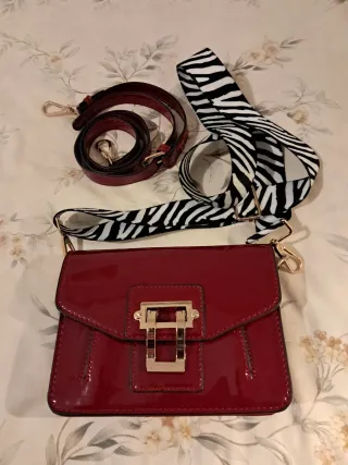Bolso de charol en color burdeos con un diseño elegante y moderno. Cuenta con una correa ajustable con estampado de cebra y otra de su propio material. - Cierre metálico dorado. - Acabado brillante.