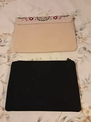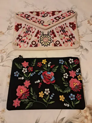 Conjunto de dos bolsos de tela, uno beige y otro negro, ambos con decoraciones. - Bolso beige con diseño geométrico y detalles de espejos. - Bolso negro con bordado floral y pedrería.