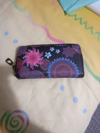 Elegante cartera de mano con un diseño llamativo y moderno. Perfecta para llevar tus esenciales con estilo. - Estampado geométrico en tonos azules, morados, negro y blanco. - Detalle central en color beige. - Tiene cinco compartimentos, para tarjetas etc, y uno de ellos con cremallera. - Cierre de cremallera principal y correa de mano. Medidas: 21cm largo x 12 cm alto. Usada una vez, como nuevo.