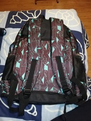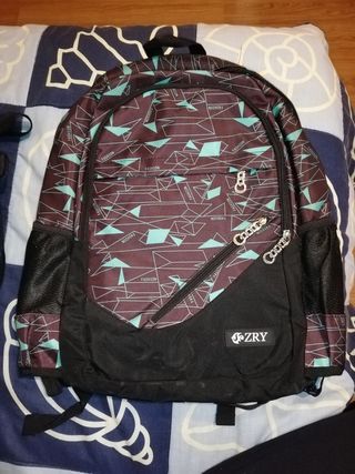 Mochila estampada impermeable ZRY. Muy cuidada. Múltiples bolsos (4 exteriores) y 6 compartimentos interiores. 2 rejillas laterales portabotellas. Trasera y tirantes muy acolchados