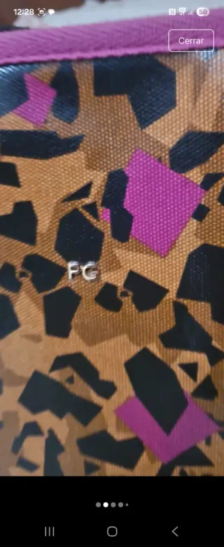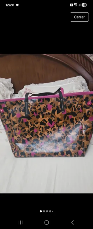 Bolso de mano con un llamativo estampado. Impecable - Diseño con estampado de leopardo y detalles en fucsia. - Asas negras. - Ribete en color fucsia.