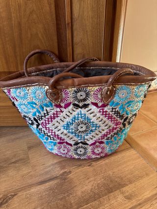 Capazo de estilo artesanal con un diseño único y colorido. - Bordados florales y geométricos. - Asas de cuero. - Interior forrado.