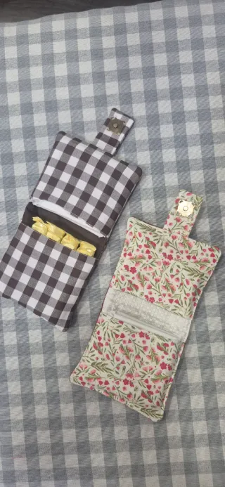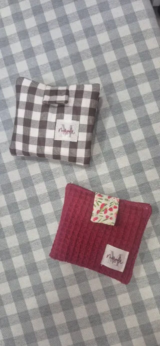 Neceser íntimo con un diseño estampado. Para mantener tus tampax y compresas organizadas en el bolso HECHO A MANO - Estampado de cuadros marrones y blancos. - Estampado de topos rojos y blancos.