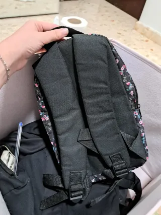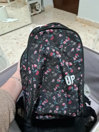 Mochila pequeña con estampado floral y el logo UP en blanco. - Diseño con flores rosas y grises sobre fondo negro. - Cremallera principal. - Bolsillo frontal. SOLO VENTA EN SEVILLA, tne solo un uso. Es de la marca sprinter.
