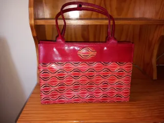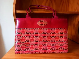Bolso de piel con un llamativo estampado. - Diseño con ondas en rojo, negro y detalles dorados. - Asa superior. - Adorno ovalado en la parte frontal. Piel de cabra, pequeña marca en la parte delantera, quinta foto, casi imperceptible. Medidas en las fotos. Bolsillo interior con cremallera