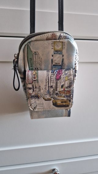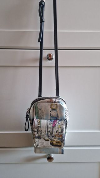Bolso pequeño con un estampado urbano de estilo acuarela. - Diseño de ciudad con edificios y taxis. - Cierre de cremallera. - Bolsillo frontal.