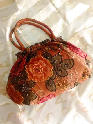 Elegante bolso de gasa con un bonito estampado floral y detalles de bordados. - Diseño con flores y hojas, de colores delicados y combina led - Adornos de pedrería. - Cierre fruncido. - Asas de mano. - No pesa nada y tiene bastante capacidad - 33 x 27