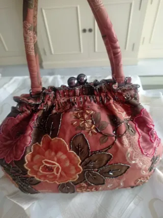 Elegante bolso de mano para mujer con un bonito estampado floral. - Diseño llamativo con flores en tonos cobre, dorado y verde. - Base negra que resalta el bordado. - Asas cómodas para llevar en la mano o antebrazo.