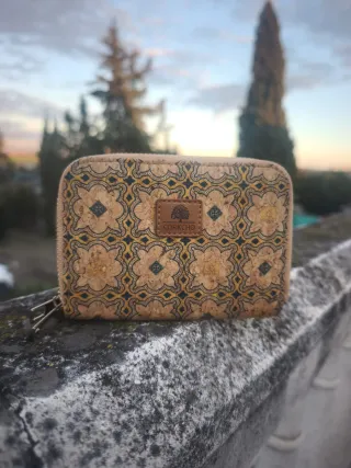 Elegante cartera de corcho con un bonito estampado. - Material: Corcho. - Diseño: Estampado floral en tonos amarillos y azules. - Cierre: Cremallera.