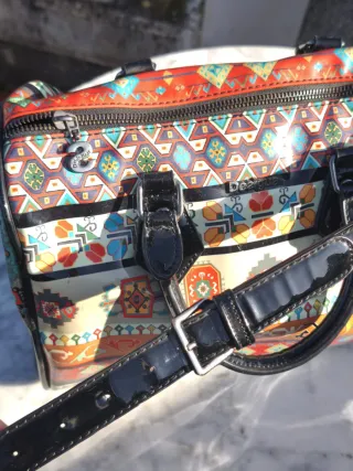 Bolso de mano con un llamativo estampado étnico y detalles en negro. - Diseño multicolor con motivos geométricos. - Asas cortas y correa larga ajustable. - Cierre de cremallera.