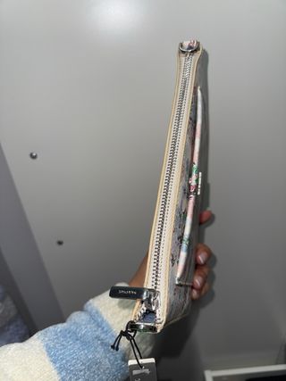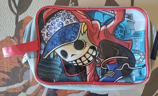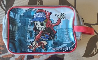 Neceser con un diseño llamativo y original. - Estampado frontal con calaveras y un fondo de ciudad. - Ribete y asa en color rojo. - Cremallera lateral negra.