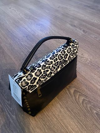 Bolso de mano con un diseño llamativo y moderno. - Asa superior. - Cierre de giro. - Detalle de tachuelas en los laterales. - Combinación de estampado de leopardo y negro.