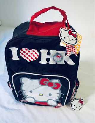 Mochila con diseño de Hello Kitty. - Estampado I Love HK en la parte frontal. - Detalle de corazón con mini corazones rojos. - Incluye un llavero de Hello Kitty. - Bolsillos laterales. Está nueva, con la etiqueta. La compré en una librería de barrio y estaba en el esta te de arriba de una estantería y parecía que llevara ahí muchísimo tiempo, por lo que se notan algunos desperfectos, pero nunca habsido usada. Tiene muchos detalles, como pines o corazones. Muy cute.