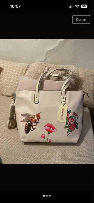 Bolso de mano con un diseño llamativo de abeja y flores. - Asa corta para llevar en la mano. - Correa larga ajustable para colgar al hombro. - Cierre principal con cremallera. - Incluye etiqueta de la marca.
