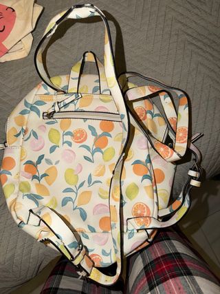 Mochila pequeña con un alegre estampado de frutas cítricas y hojas. Ideal para llevar lo esencial. - Diseño redondo. - Cierre de cremallera. - Tirantes ajustables.