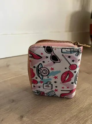 Monedero infantil con un diseño alegre y lleno de elementos. - Estampado multicolor con estrellas, labios, gafas de sol, tacones, rosas y tazas. - Cierre de cremallera para mantener todo seguro. - Tamaño compacto, ideal para llevar en bolsos pequeños.