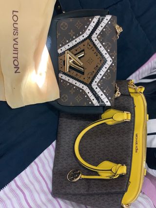 Lote de dos bolsos de mano, uno de Louis Vuitton y otro de Michael Kors. - Bolso Louis Vuitton con estampado clásico y detalles en blanco y dorado. - Bolso Michael Kors con monograma y detalles en amarillo. - Ambos bolsos son de mano y cuentan con asas.