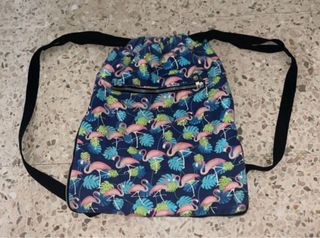 Práctica bolsa de tela con estampado de plumas. - Diseño estilo mochila. - Cierre con cordón. - Tirantes de cuerda.