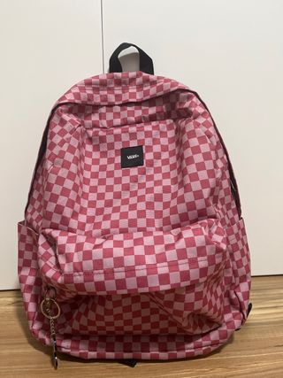 Mochila con un llamativo diseño de cuadros. - Estampado checkerboard en tonos rosas y rojos. - Etiqueta de la marca Vans en la parte frontal.