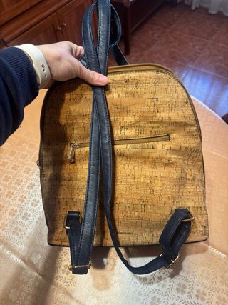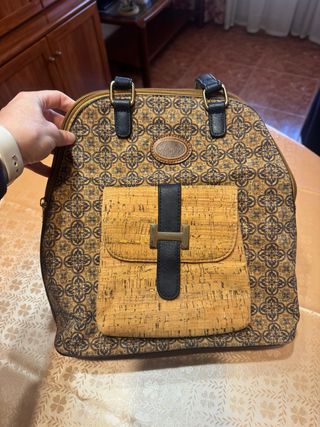 Bolso y mochila con un diseño único y original. - Material principal de corcho. - Estampado geométrico en tonos oscuros. - Bolsillo frontal con detalle metálico.