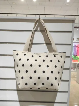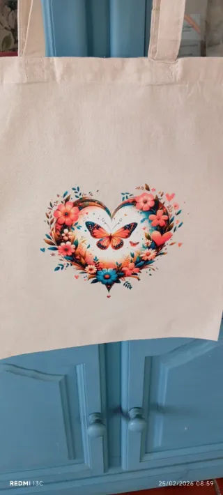 Bolso de tela con un bonito diseño. Buscame en Tictoc Tarazona 375. - Estampado frontal de corazón con flores y mariposa. - Asas de tela resistentes. - Color base beige.