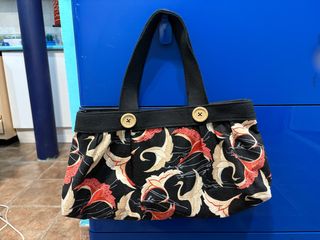 Bolso de mano con un bonito estampado. - Hecho en Japón - Diseño con grullas y motivos orientales. - Asas negras de tela con adorno de 2 botones de madera - 2 bolsillos interiores