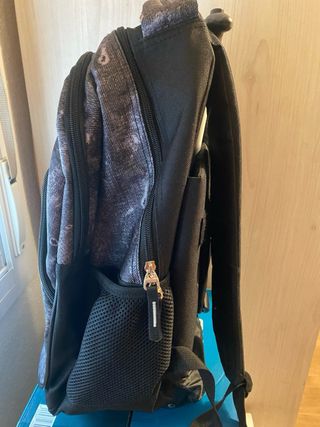 Mochila de viaje con un diseño moderno y práctico. - Estampado tipo denim desgastado en tonos negros y grises. - Compartimento principal espacioso. - Bolsillo frontal con cremallera. - Asas acolchadas y ajustables.