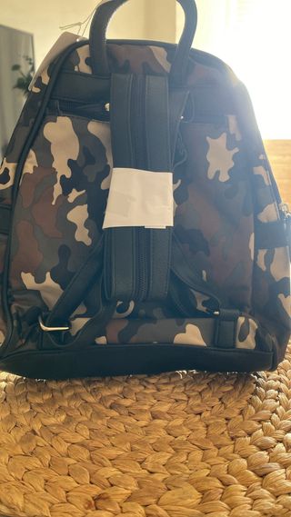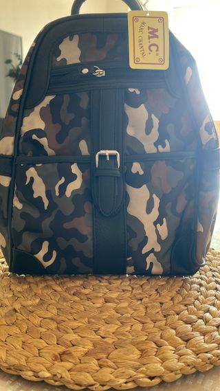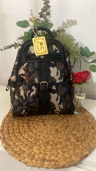 Mochila con diseño militar de la marca M.C. Marc Chantal. - Estampado camuflaje en tonos marrones y verdes. - Asas y detalles en piel sintética negra. - Cierre de cremallera principal.