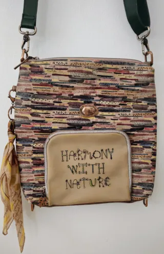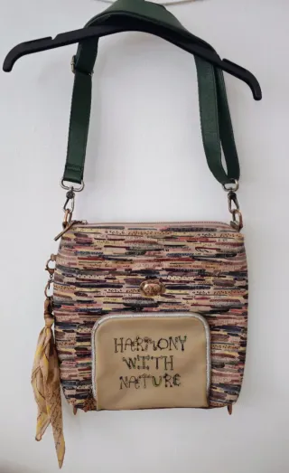 Bolso de hombro con un diseño vibrante y lleno de detalles. - Estampado multicolor con motivos de la colección Harmony. - Bolsillo frontal con el mensaje Harmony With Nature. - Correa ajustable para llevar al hombro. - Incluye un pañuelo decorativo atado a un lateral.