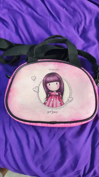 Bolso de muñeca con un encantador diseño de Santoro. - Estampado de corazones en tonos rosas. - Detalle de rayas verticales en un lateral. - Muñeca Gorjuss característica de la marca.