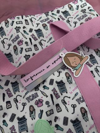 Bolso con estampado de Enfermera en Apuros y motivos relacionados con la profesión TCAE. Es un accesorio práctico y con un diseño original. - Estampado Enfermera en Apuros. - Motivos TCAE (carritos, jeringuillas, tijeras, etc.). - Asas de tela rosa.
