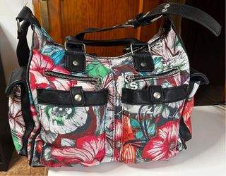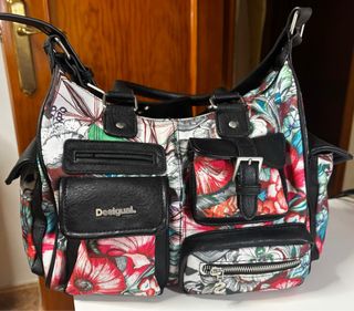 Bolso Desigual con un llamativo estampado floral. - Diseño con múltiples bolsillos frontales. - Cierre de cremallera y hebilla. - Asa de mano y correa ajustable.