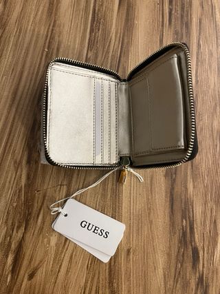 Elegante cartera de la marca Guess con un estampado distintivo. - Diseño bicolor en marrón y negro. - Estampado con el logo de la marca. - Cierre de cremallera.