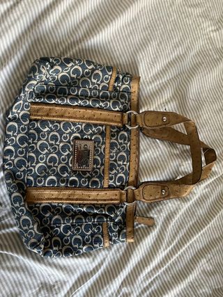 Bolso Guess original con un diseño elegante y estampado en tonos azul y beige. Amplio y funcional, ideal para el uso diario. - Cierre principal con cremallera. - Interior forrado con varios bolsillos organizadores. - Asas resistentes. - Combina tela estampada con detalles tipo piel. - Tamaño mediano. - En buen estado general con signos normales de uso.