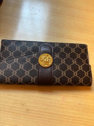 Elegante billetera con un diseño clásico y un toque de distinción. - Estampado distintivo en tono marrón. - Detalle frontal con broche dorado. - Acabado en piel sintética. Impecable, nunca se ha usado