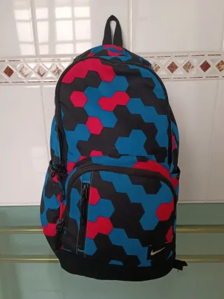 Mochila con un llamativo diseño hexagonal en tonos azules y rojos. Perfecta para el día a día. - Estampado geométrico. - Cierre de cremallera. - Bolsillo frontal con cremallera. - Logo de Nike visible.