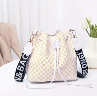 Bolso tipo cubo con un diseño elegante y llamativo. Su estampado geométrico en tonos dorados sobre fondo blanco le da un toque sofisticado. - Cierre de cordón ajustable. - Correa de hombro con texto. - Detalle de asa corta. - Diseño moderno y versátil.