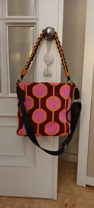 Bolso de Parfois con un llamativo estampado geométrico, tejido de lona, diseño con círculos en rosa y naranja, fondo en color burdeos, con asa corta para llevar al hombro o brazo y otra larga para llevar como bandolera, las dos son extraibles, medidas 27 cm de largo x 27 cm de alto x 12 de ancho, muy buen estado, casi sin uso, puedes ver más en mi perfil.