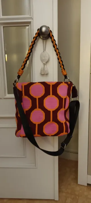 Bolso bandolera con un diseño llamativo y vibrante, de estilo étnico, hecho de algodón. Cremallera también en la parte trasera - Estampado geométrico en tonos rojos y morados. - Correa ajustable para mayor comodidad. - Cierre superior con solapa.