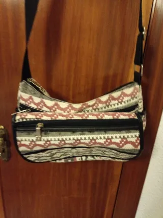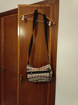 Bolso bandolera con un diseño étnico y moderno. Perfecto para el día a día. - Estampado geométrico en tonos beige y multicolor. - Cierre principal con cremallera. - Bolsillo frontal con cremallera. - Correa ajustable para llevar al hombro o cruzado.