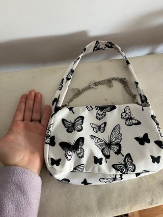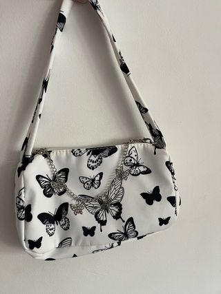 Bolso con un llamativo estampado de vaca y detalles de cadena. - Diseño moderno y juvenil. - Cadena plateada con adornos de mariposa. - Asa cómoda para llevar al hombro.