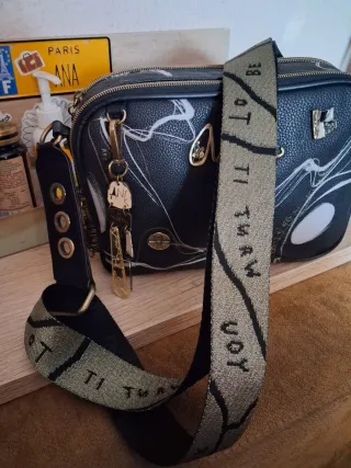Bolso de la marca Tous con un diseño estampado único. Se encuentra en excelente estado, casi como nuevo. - Color principal: negro con estampado gris. - Cierre de cremallera. - Asas de mano y correa ajustable. - Detalle metálico dorado con el logo de la marca.