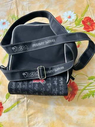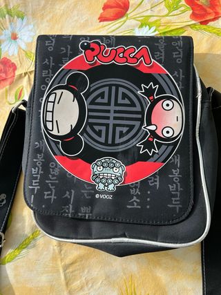 Bolso bandolera con diseño del personaje de anime Pucca. Presenta un estampado llamativo con caracteres asiáticos y un dibujo central. Bolsillo interior con cremallera. - Cierre de solapa. - Correa ajustable para llevar al hombro. - Detalle del logo VOOZ en la parte inferior.